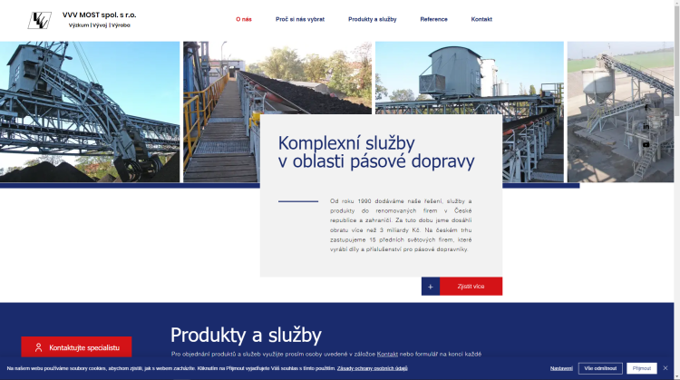 Společnost VVV MOST spol. s r.o. byla založena v roce 1990. První tři písmena v názvu společnosti označují prvotní aktivity společnosti: výzkum, vývoj a výrobu. Počáteční aktivity byly zaměřeny převážně na expertizy týkající se problematiky dopravních pásů. Během následujících let byla činnost firmy postupně rozšiřována. V současné době nabízíme komplexní služby v oblasti projekce, výroby a údržby pásových dopravníků a dodávky zařízení na třídění kameniva, štěrků a písků.